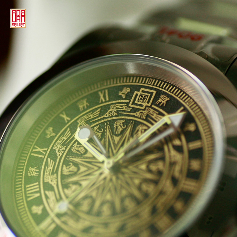 – Kính Sapphire nguyên khối – Mặt số họa tiết trống đồng Đông Sơn (chất liệu inox hoặc đồng tùy chọn) hoặc vân Guilloche khắc tên khách hàng – Kim như hình dưới – Máy cơ tự động Seiko NH35A, NH38A (tùy chọn có open heart hay không) – Dây cao su kèm khóa bướm khắc tên hoặc dây kim loại kiểu Rolex Oyster – Độ chống nước: 10ATM |