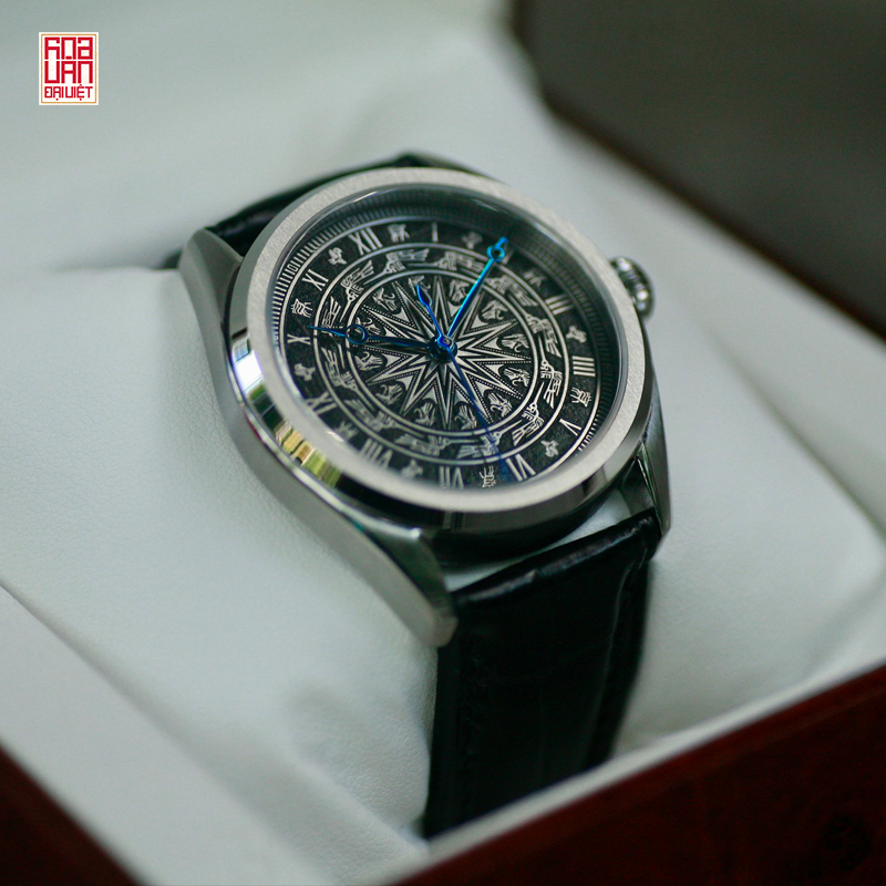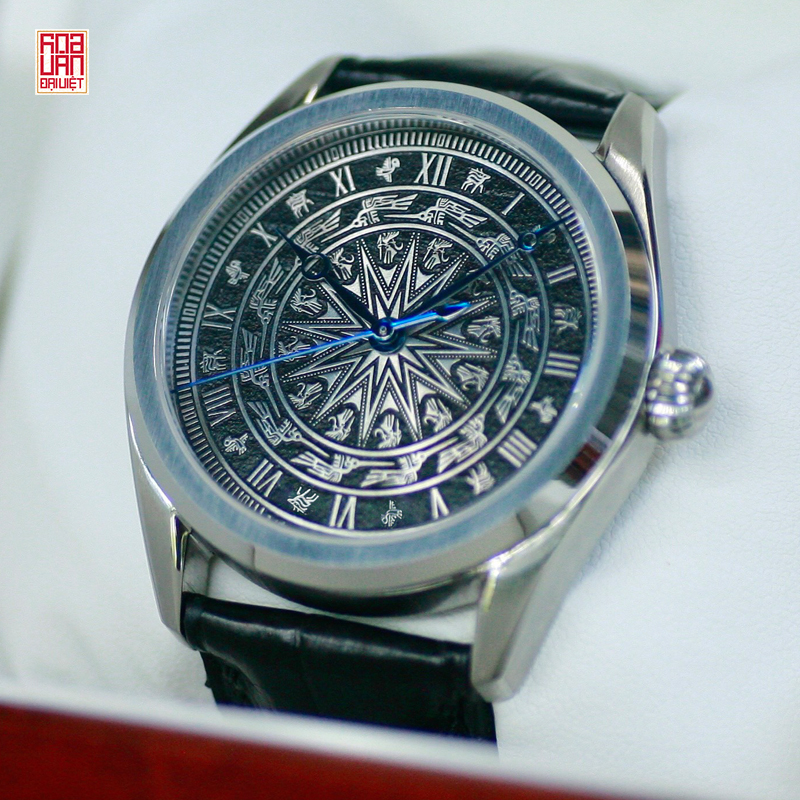 – Kính Sapphire nguyên khối – Mặt số họa tiết trống đồng Đông Sơn (chất liệu inox hoặc đồng tùy chọn, bản vẽ tùy chọn) hoặc vân Guilloche – Máy cơ tự động Seiko NH35A, NH38A (tùy chọn có open heart hay không) – Dây da handmade, khóa bướm khắc theo yêu cầu hoặc dây kim loại – Độ chống nước: 5ATM (đi mưa, rửa tay được nhưng hạn chế) |