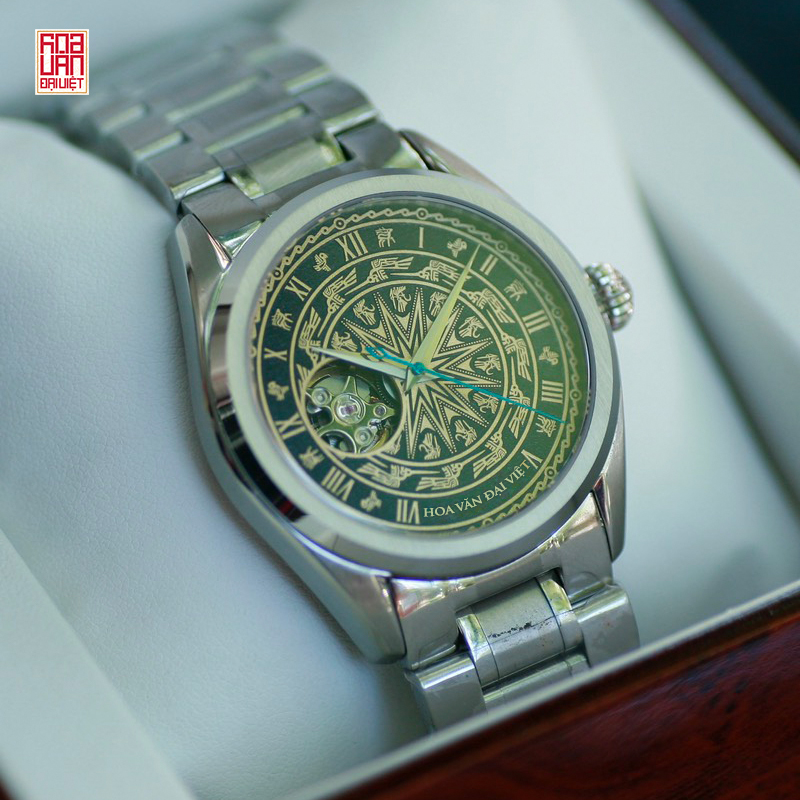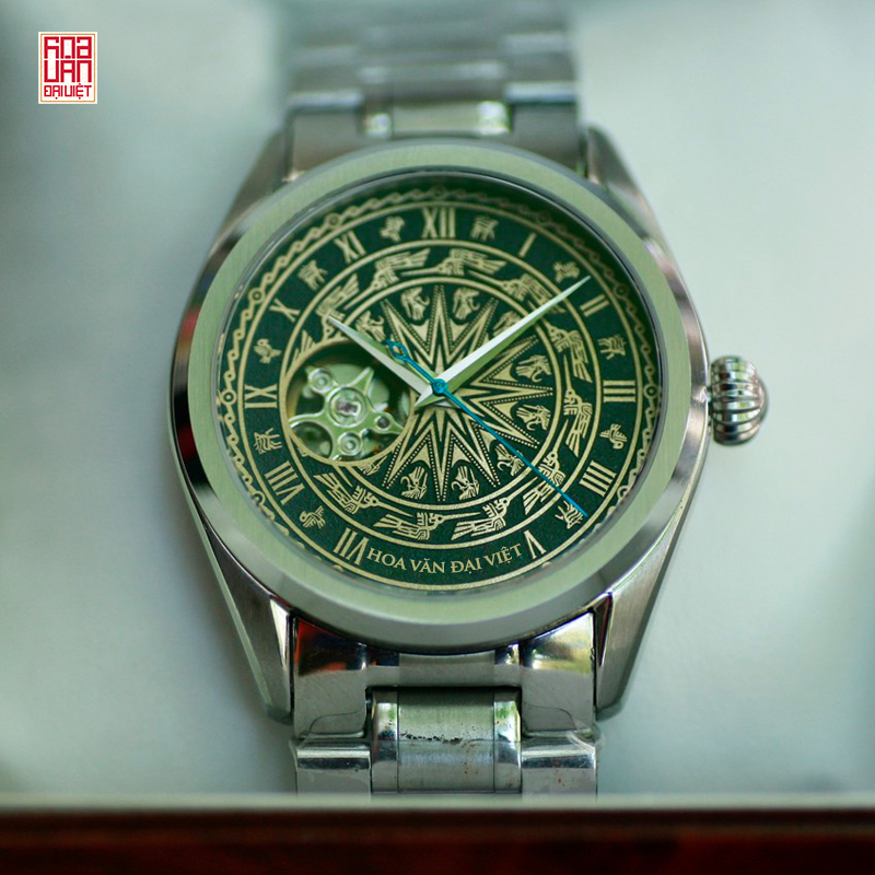 – Kính Sapphire nguyên khối – Mặt số họa tiết trống đồng Đông Sơn (chất liệu inox hoặc đồng tùy chọn, bản vẽ tùy chọn) hoặc vân Guilloche khắc tên khách hàng – Máy cơ tự động Seiko NH35A, NH38A (tùy chọn có open heart hay không) – Dây da handmade, khóa bướm khắc theo yêu cầu hoặc dây kim loại – Độ chống nước: 5ATM (đi mưa, rửa tay được nhưng hạn chế) |