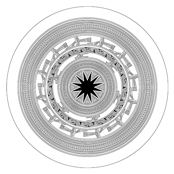 Hoa văn mặt trời 12 cánh, hình chim và chim tiên cùng hoa văn hình học.