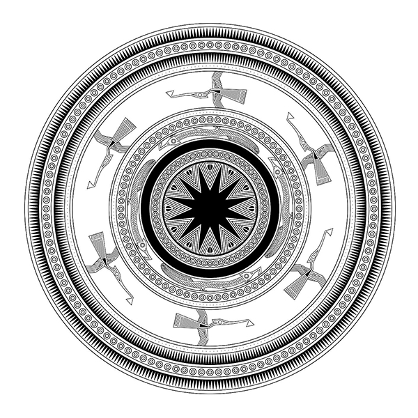 Hoa văn mặt trời 12 cánh cùng chim Tiên và hoa văn thú 4 chân.